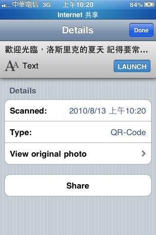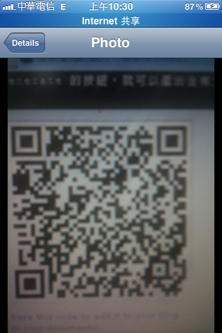 QRReader,然後開啟程式後,會開啟照相模式,把鏡頭接近QR code,它就會自動解